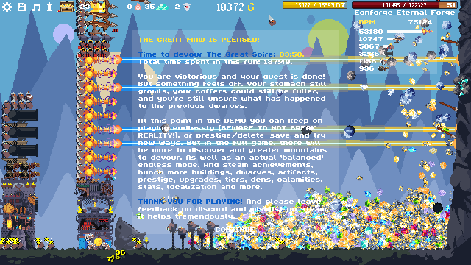 As far as losing goes, initially the idea was that calamities/dens could also destroy buildings, or at least slow them down, as well as actually kill dwarves/runners, but that wasn't very fun and didn't add much but frustration. However I will be adding a few ways to lose / be forced to prestige, such as a DPS/PP-check at say mountain level 75, probably in the form of a boss. Plus probably another key-like gate at lvl 100 or so, where you need unique artifacts obtained from forging/alchemy/spelunkers to progress.