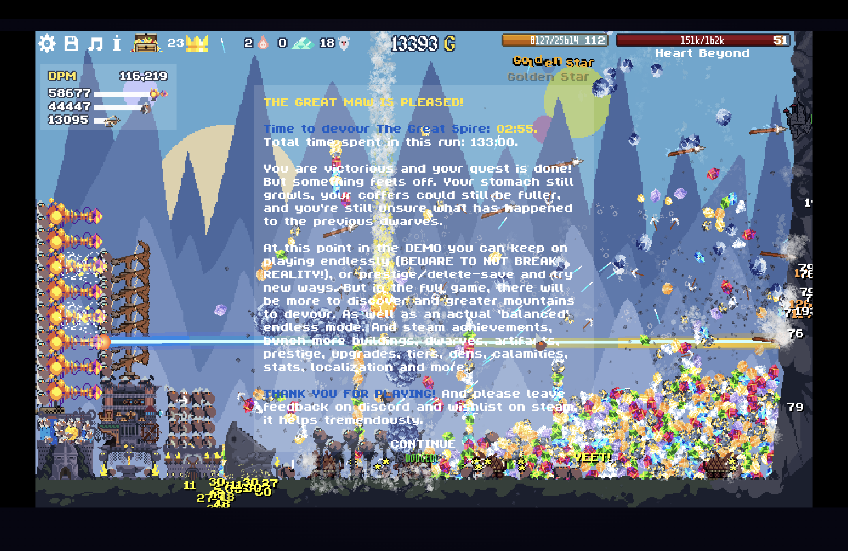 - This demo shows a lot of the core game content. The end goal is mountain level 50 which is achievable in the demo and can take up to 2-4 hours. The full game will add a true ending at level 100, as well as support endless mode (which already exists to unfinished degree). However, to try all the demo content, buy all the prestige upgrades and collect all the artifacts, it can easily take you dozens of hours.