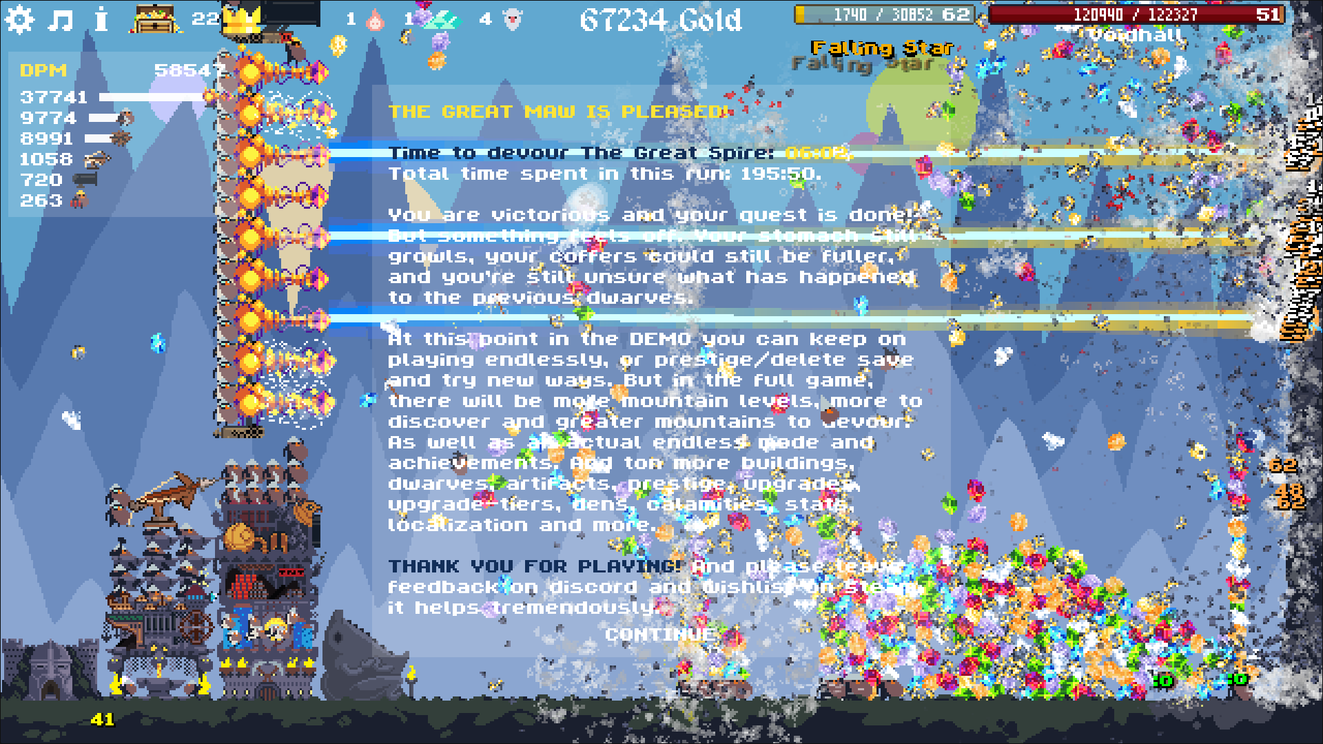 Man that's just funny that den health outscales the mountain at that stage. Exponential scaling is tough. But yeah the demo kinda ends at lvl 50 and there is no actual refined endless mode yet. Things just keep on going and scaling way too much. For the full release I will try to make endless mode actually "balanced", though it's not gonna be easy with the way the game works. It was never meant to be the kind of incremental game where you keep going indefinitely and the numbers become indecipherably big.