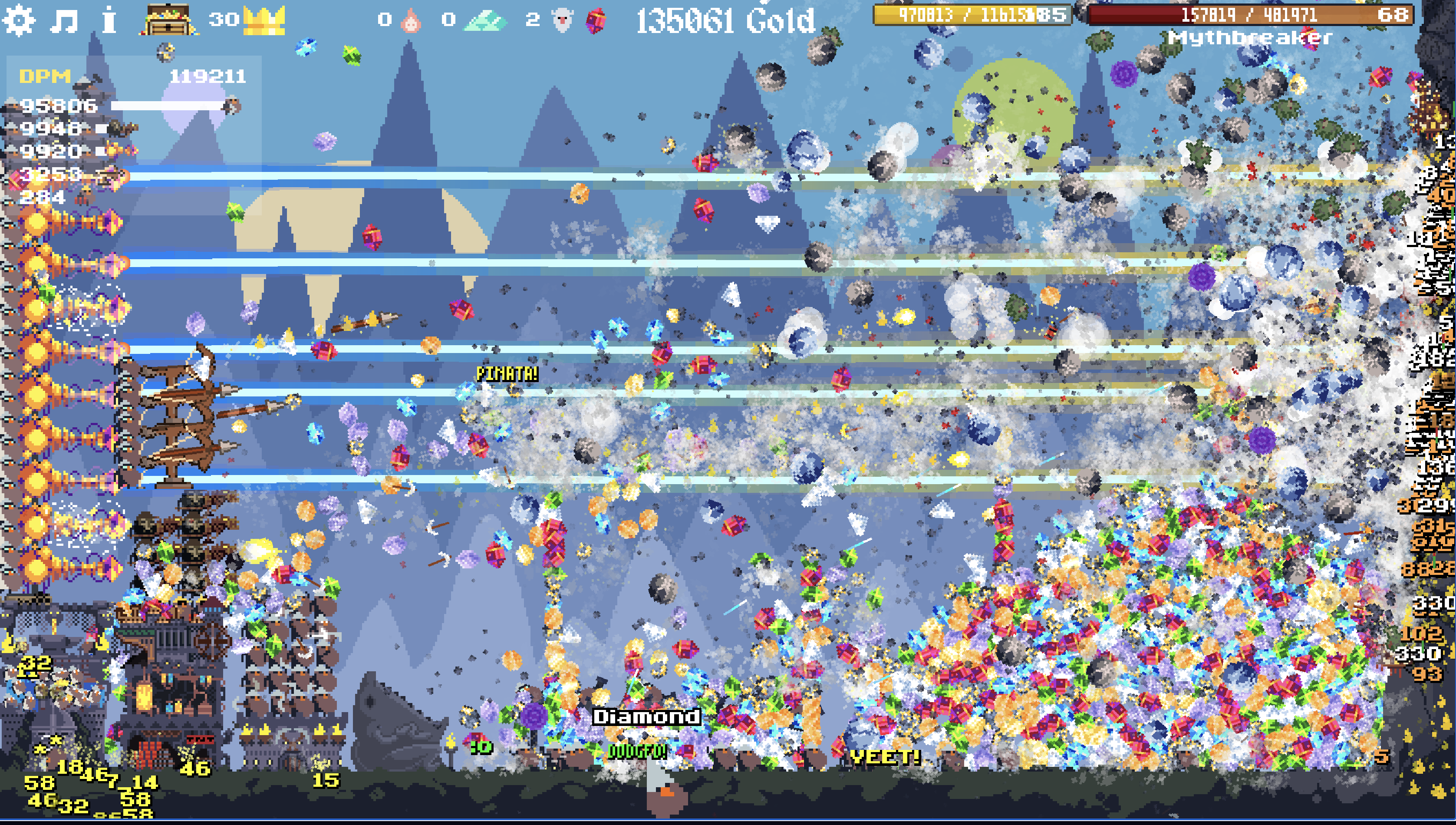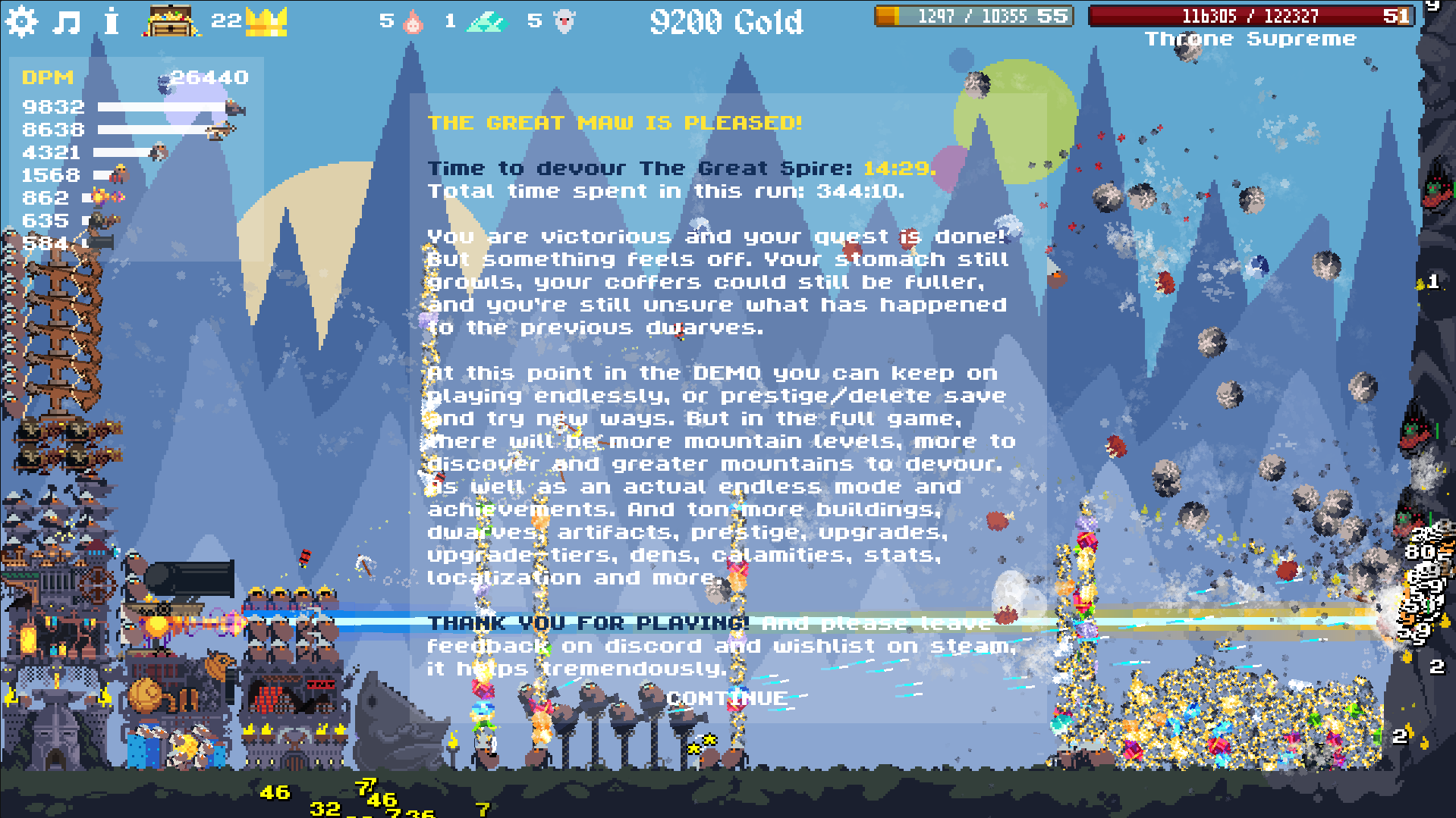 Man that's just funny that den health outscales the mountain at that stage. Exponential scaling is tough. But yeah the demo kinda ends at lvl 50 and there is no actual refined endless mode yet. Things just keep on going and scaling way too much. For the full release I will try to make endless mode actually "balanced", though it's not gonna be easy with the way the game works. It was never meant to be the kind of incremental game where you keep going indefinitely and the numbers become indecipherably big.