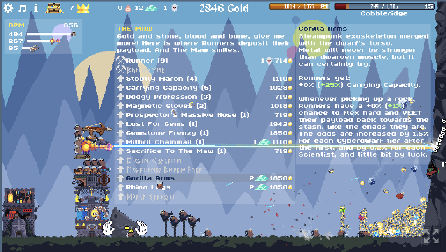 Even with max upgraded runners and max cyberdwarves, I can't come close to picking up everything. I see from other comments you want this to be a balance feature and I agree, but I think it's poorly implemented. For one, there are so many options for upgrading weapons and different types of weapons. It's fun and exciting to see all the ways I can clear stages and dens faster. There's only one option for collecting loot: the runners. I'm spending most of my gameplay worried about how I can get my runners up to speed with my weapons, which I didn't even invest into damage (only reload and gem chance), and feeling like I'm always behind rather than looking forward to better upgrades. I think there's only like one or two prestige upgrades that affect runners in a meaningful way; I was on t3 of prestige upgrades and couldn't wait to prestige again cuz I realized I really wanted to get the 300 ore overflow one, that's how necessary it felt. At this time, I feel punished for investing into weapons and it seems like putting everything into runners is the best strat, which is unfortunate cuz watching dwarves pick up ores is not nearly as exciting as watching my weapons mine them. Even then, having max upgrades on runners doesn't ever get me to a point where I'm collecting more than I mine. It feels bad when I have all artifacts and I'm still softlocked cuz having 25 runners means the next one is almost 200k gold for an increase I don't even know will fix my collection problem considering the jump from 20-25 didn't fix it in the first place. For weapons I can get more scientists to mitigate the cost of upgrades, but there's nothing to lower the cost of dwarves.